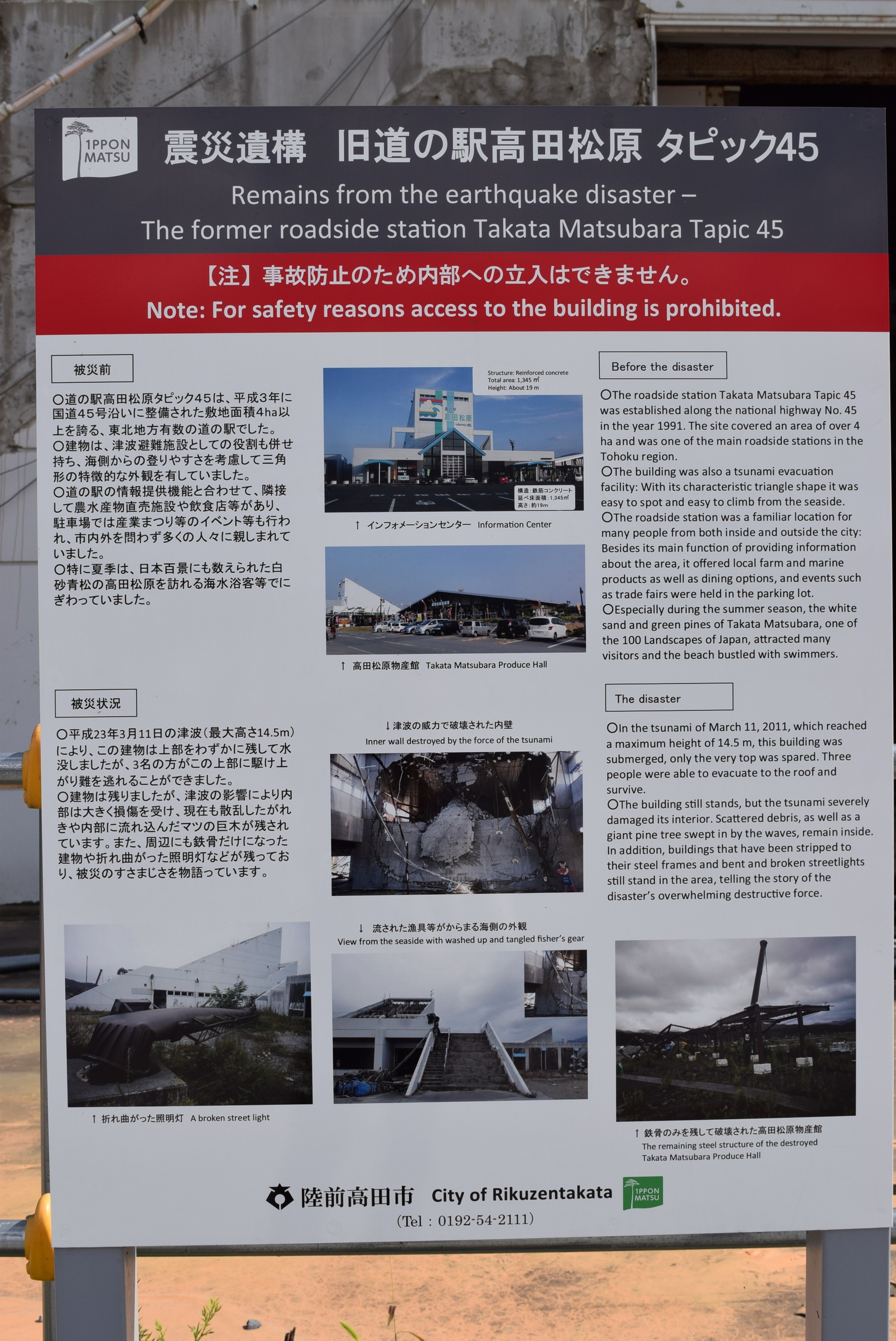 最初に訪れたのは、「タピック45(道の駅高田松原)」という震災遺構でした。ここは、3月11日当時、津波が13.7メートルまで達しました。そんな中でも最上階まで避難した5名が助かったことでも有名です。