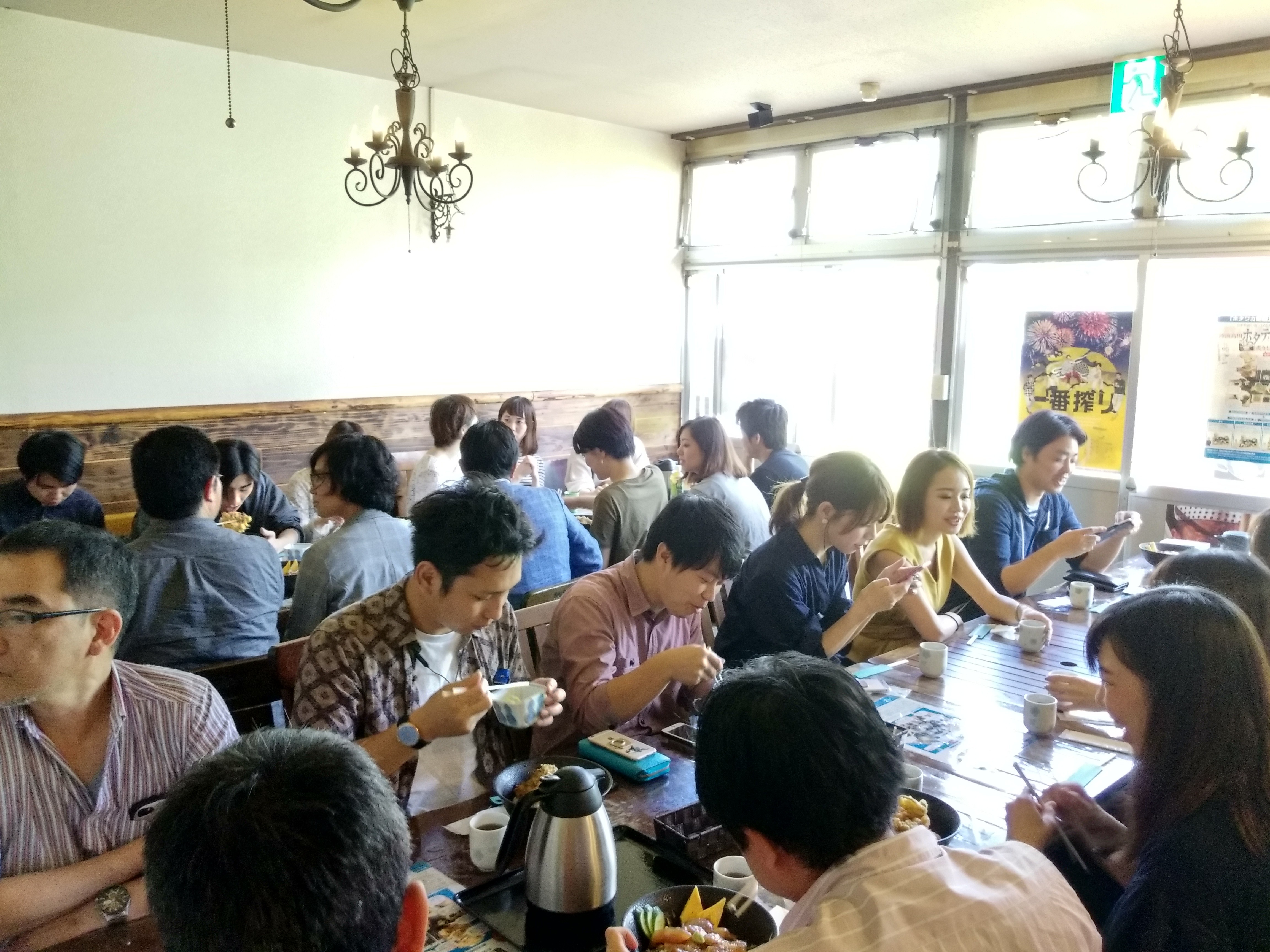 ホタテかき揚げ丼定食、ホタテ塩ラーメンセット(おにぎり付)、なっちく定食、チキンソースカツ丼定食、まぐろづけ丼定食の中から選びます。どれも地元の食材を使っているということで、全員で美味しくいただきました。