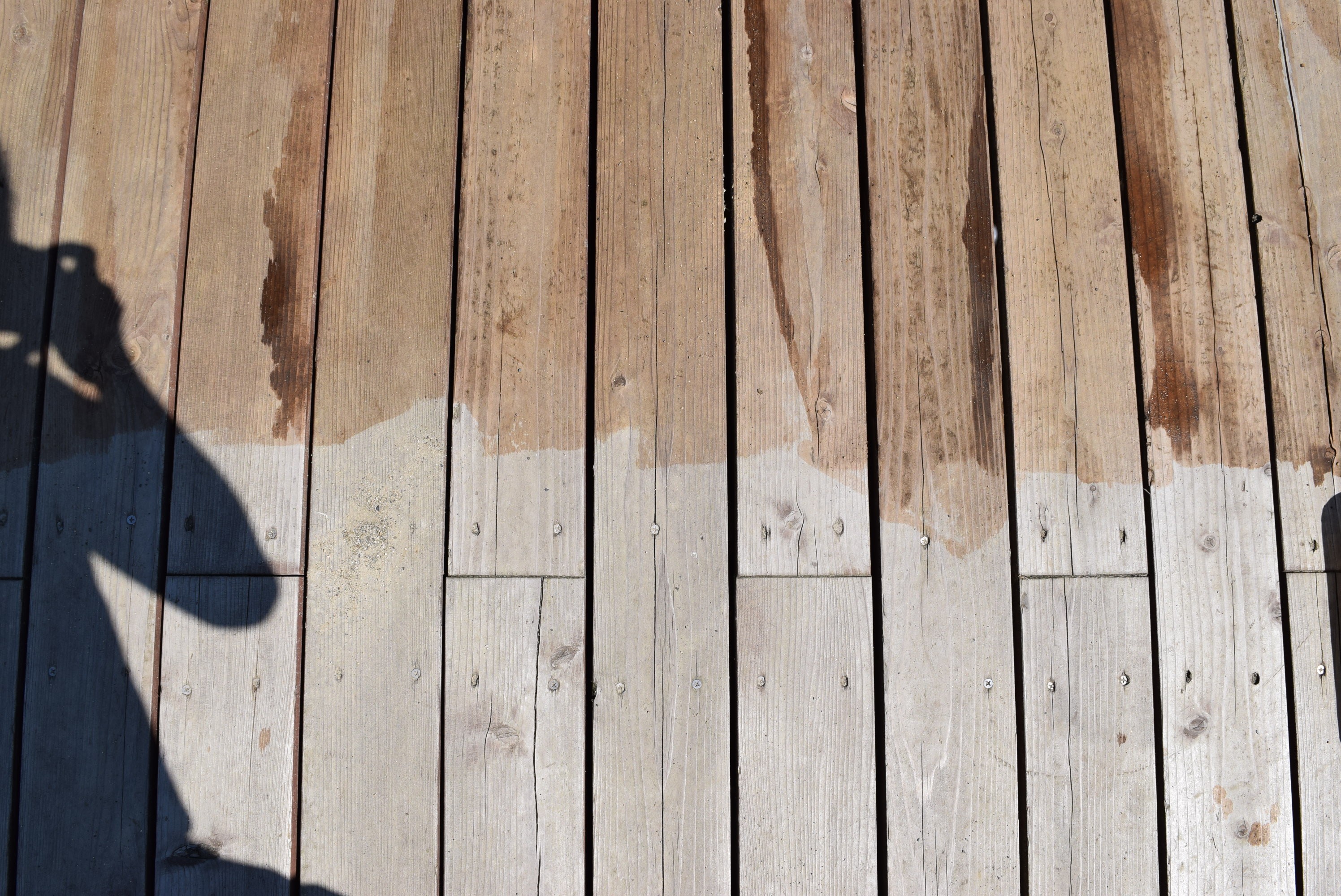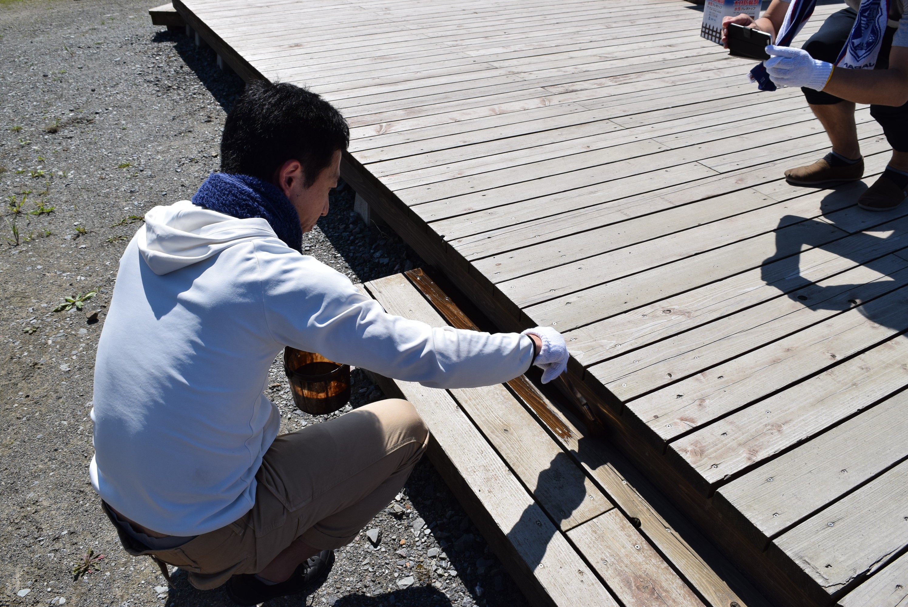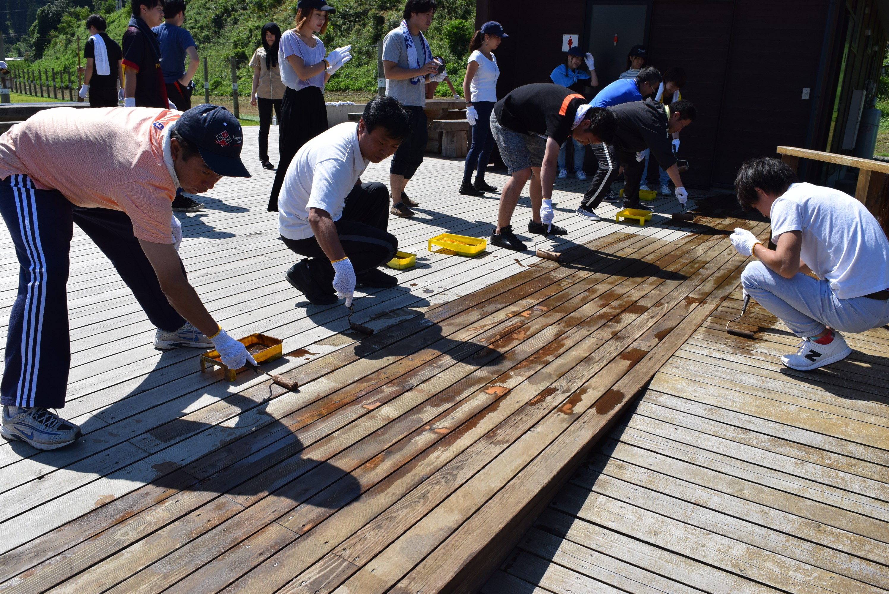 汗を流しながら、「腰が痛い」、「膝が痛い」という言葉をこぼしながらも、DIYをやっている感覚で、皆さん、楽しそうに声を掛け合いながら、どんどん塗っていきます。すると、どんどん木材の色が変わっていきます。