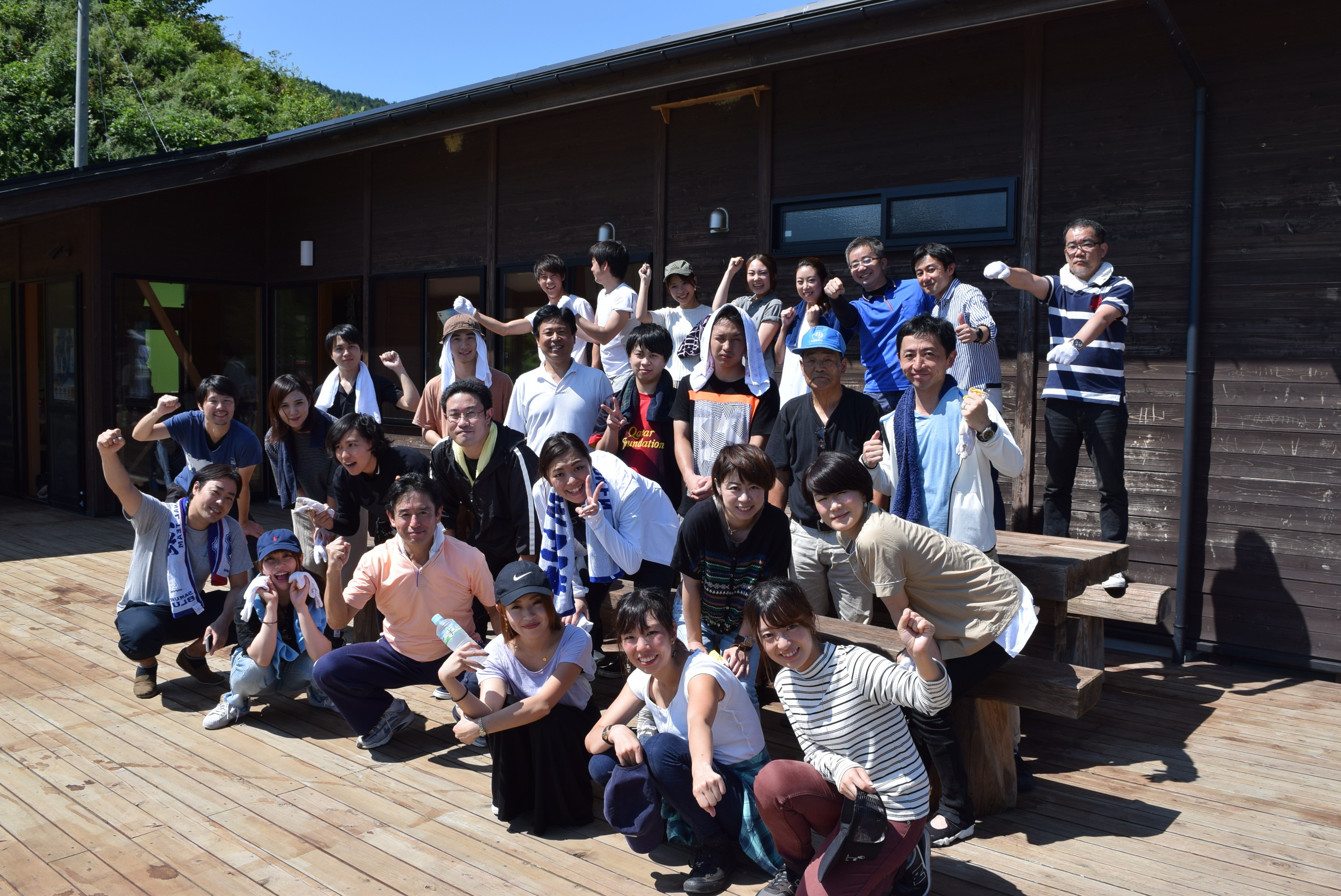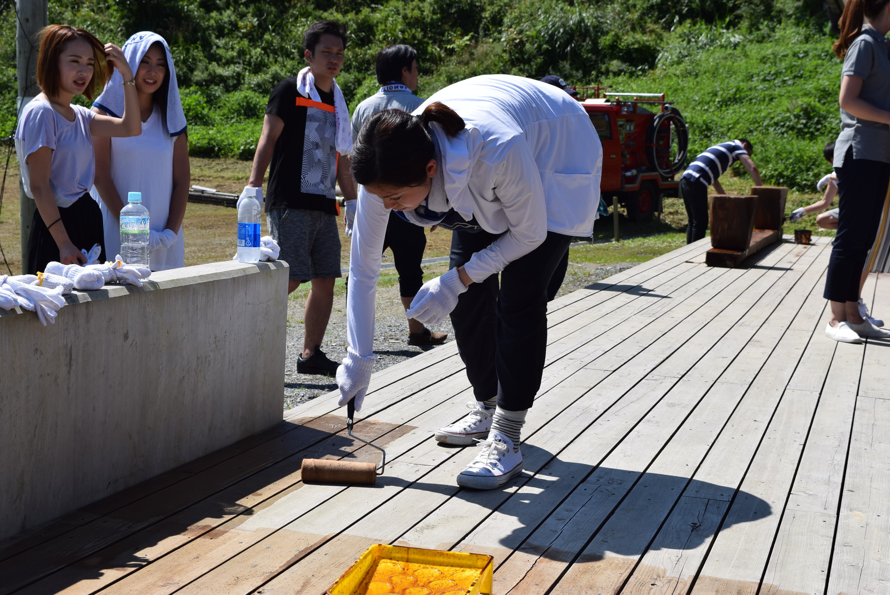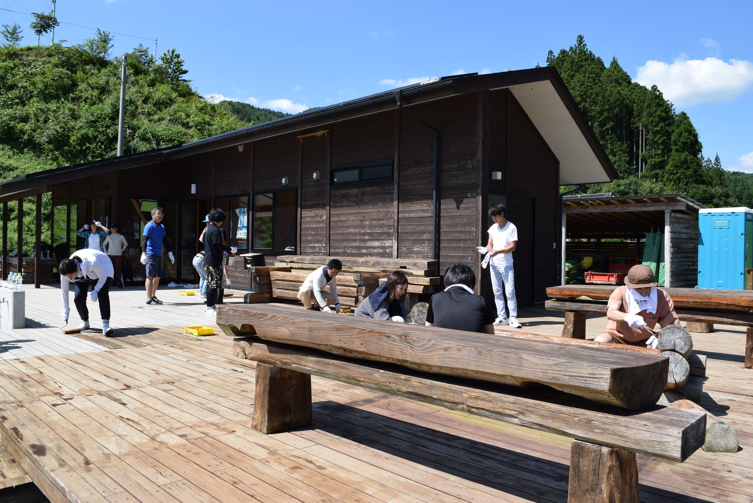 枝廣社長を先頭に、総勢27名全員で力を合わせて、クラブハウスに防腐剤を塗っていきます。