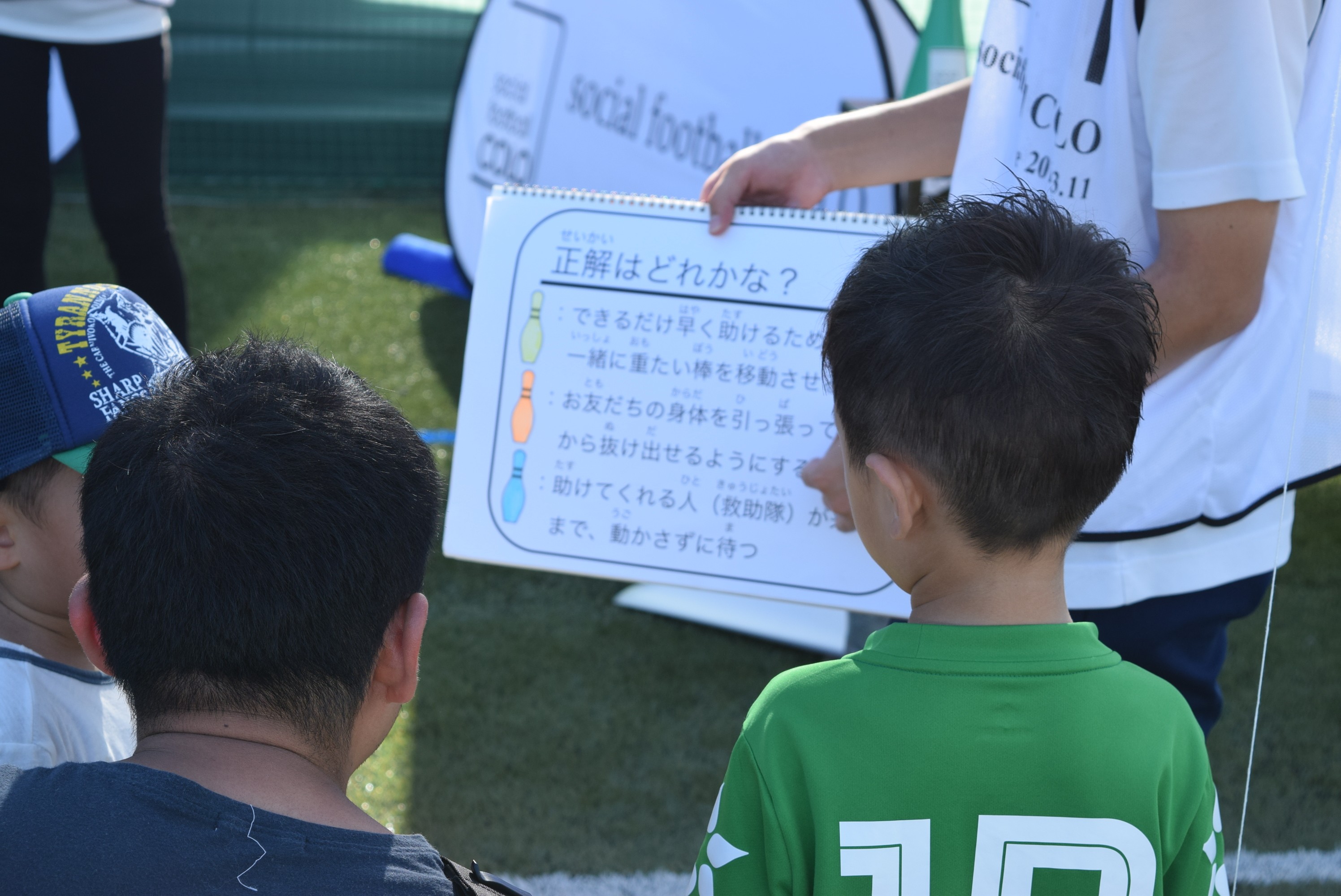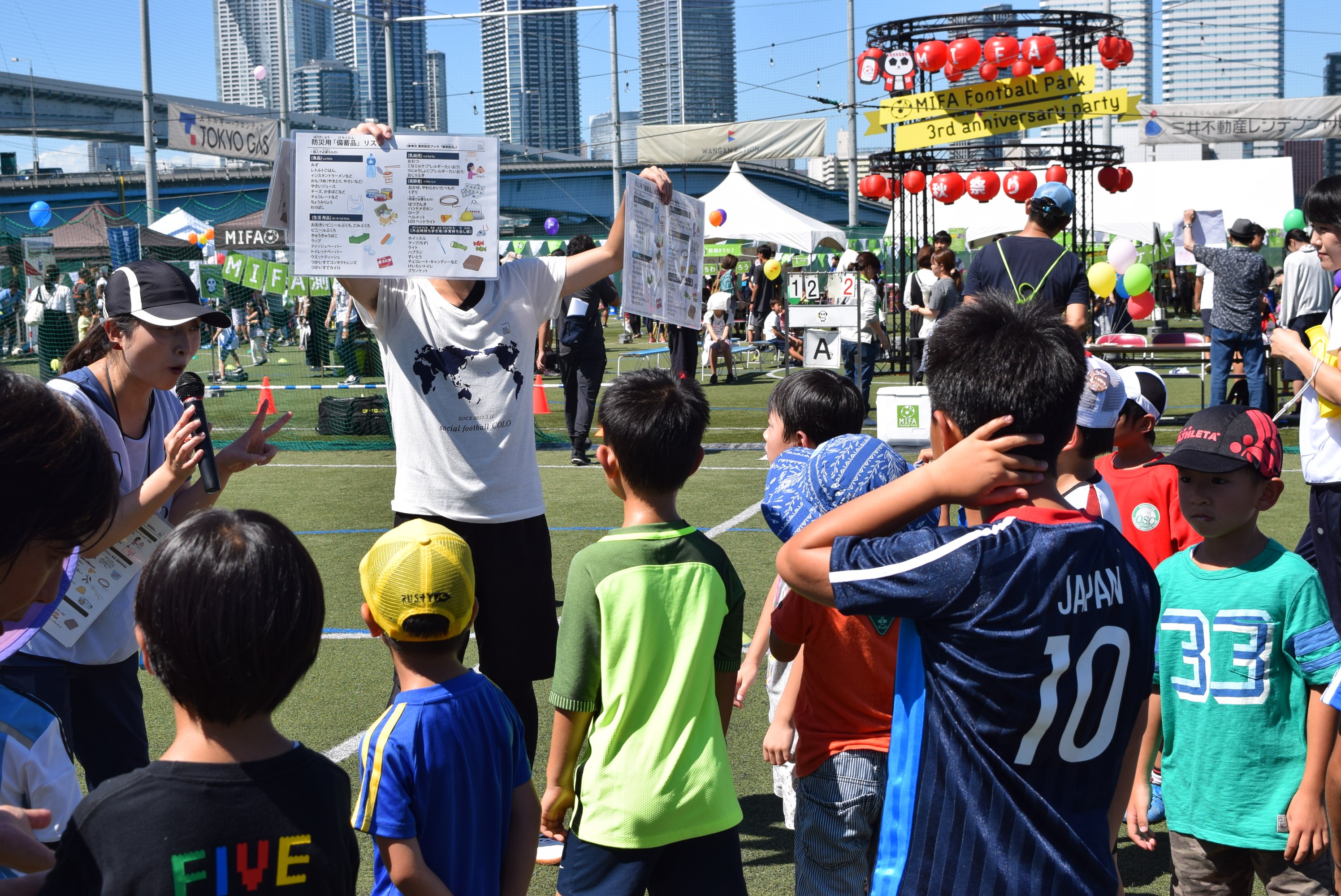 「台風の接近によって、中止になるかもしれない」という不安を吹き飛ばし、台風一過の晴天の下、無事にMIFA秋祭りが開催され、social football COLOもサッカー防災「ディフェンス・アクション」のブース出展とワークショップを実施しました。