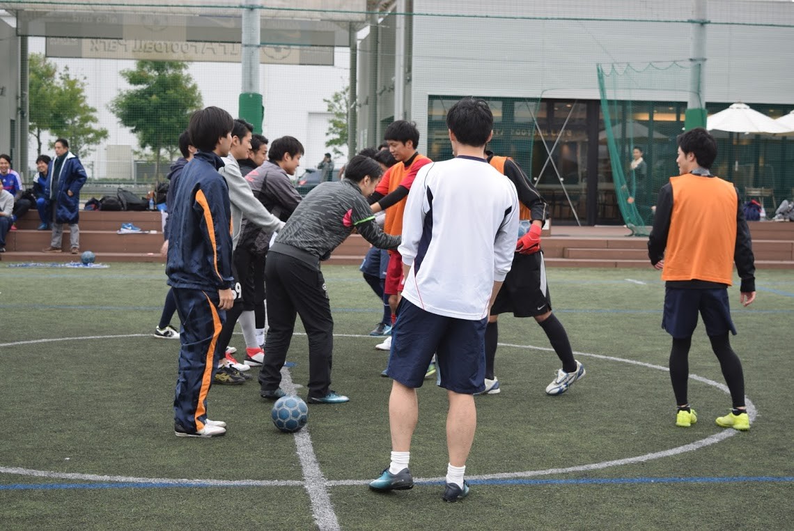 チーム内のサッカー経験者の方が、初心者の方に教えながら、対面パスの練習を行います。
