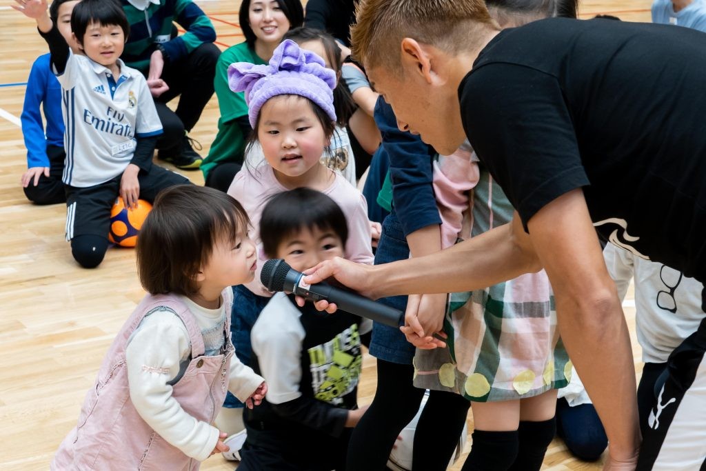 マイクを持った播戸竜二さんの周りに勢いよく集まった子どもたちが、