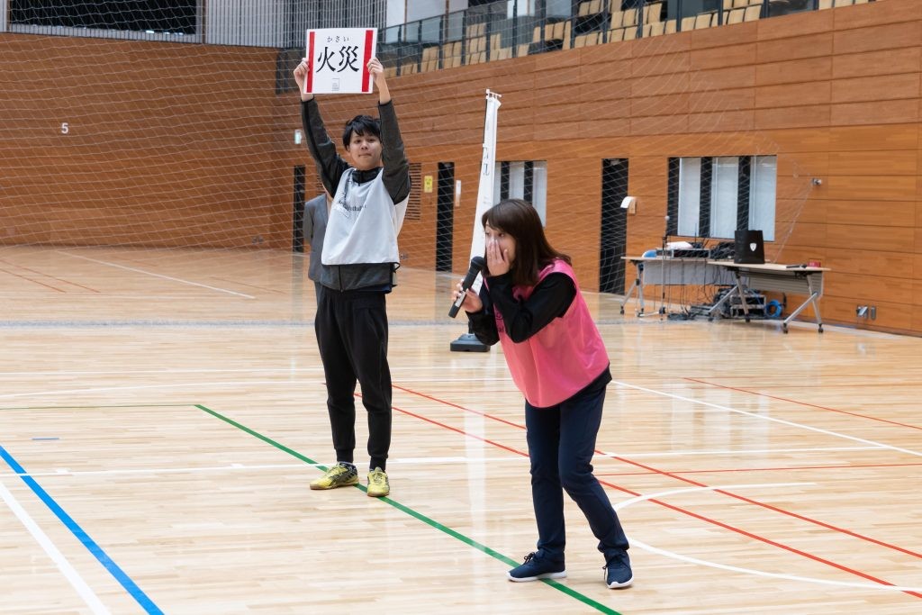 コート内をジョギングして回り、スタッフが「地震」「津波」「火災」