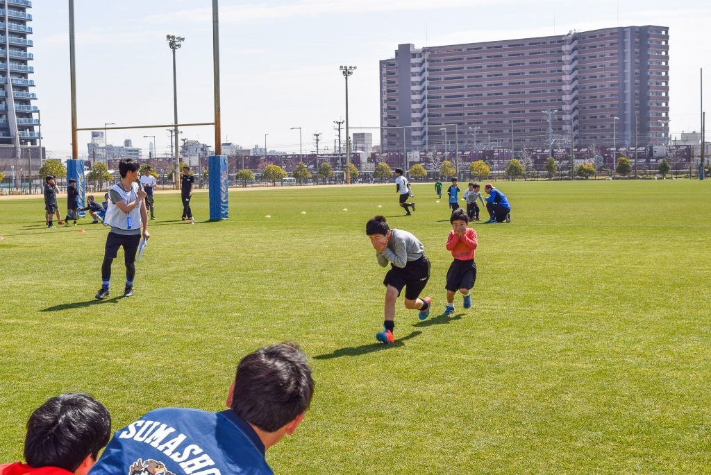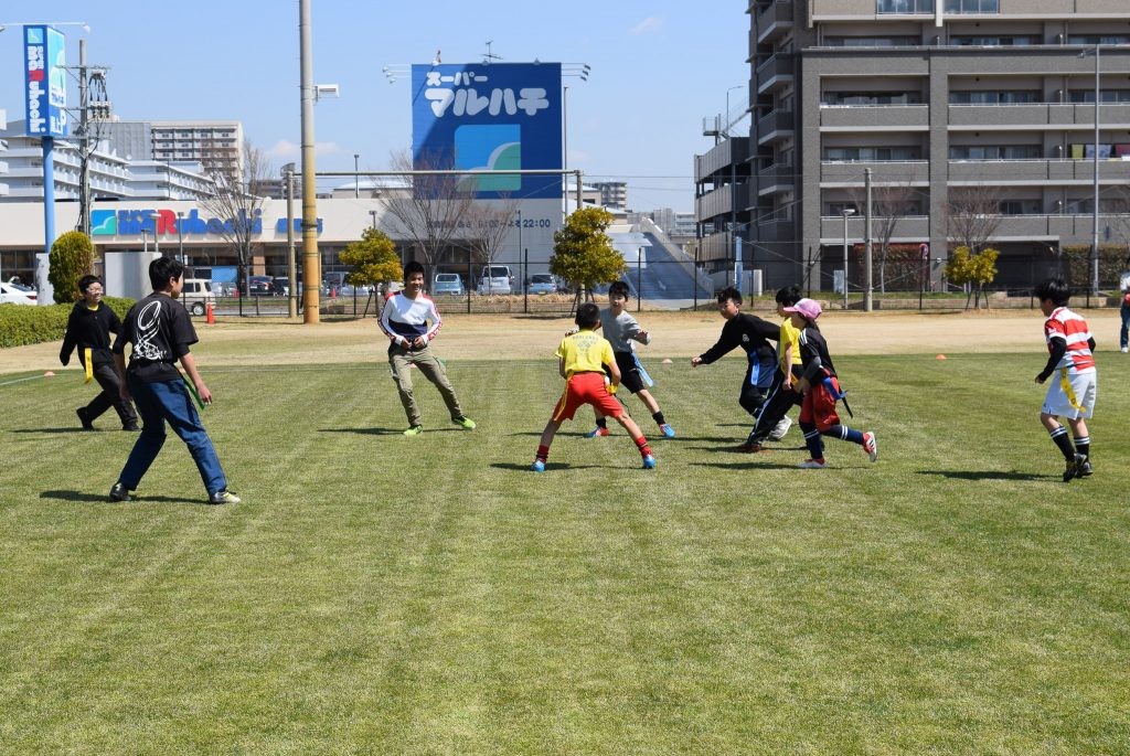 小学生の子どもたちは、タグラグビーという、布のしっぽをスボンに挟んで、