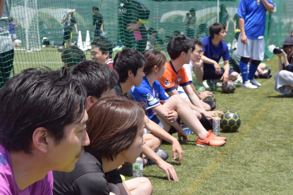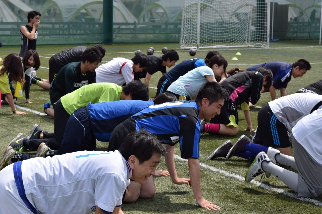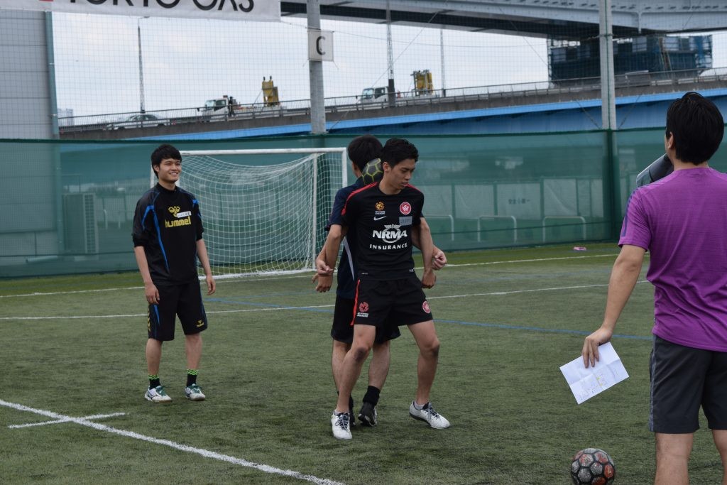 ウォーミングアップとして、social football COLOオリジナルコンテンツのディフェンス・アクション、体を動かしながら災害時の初期行動を学ぶ「ファースト・アクション」を行いました。