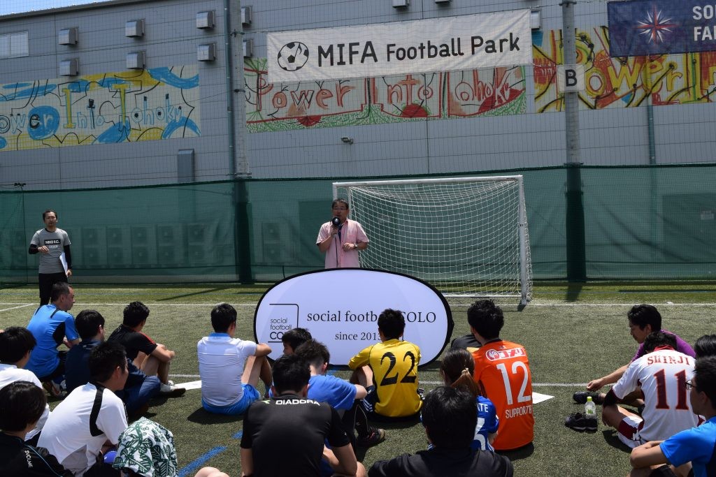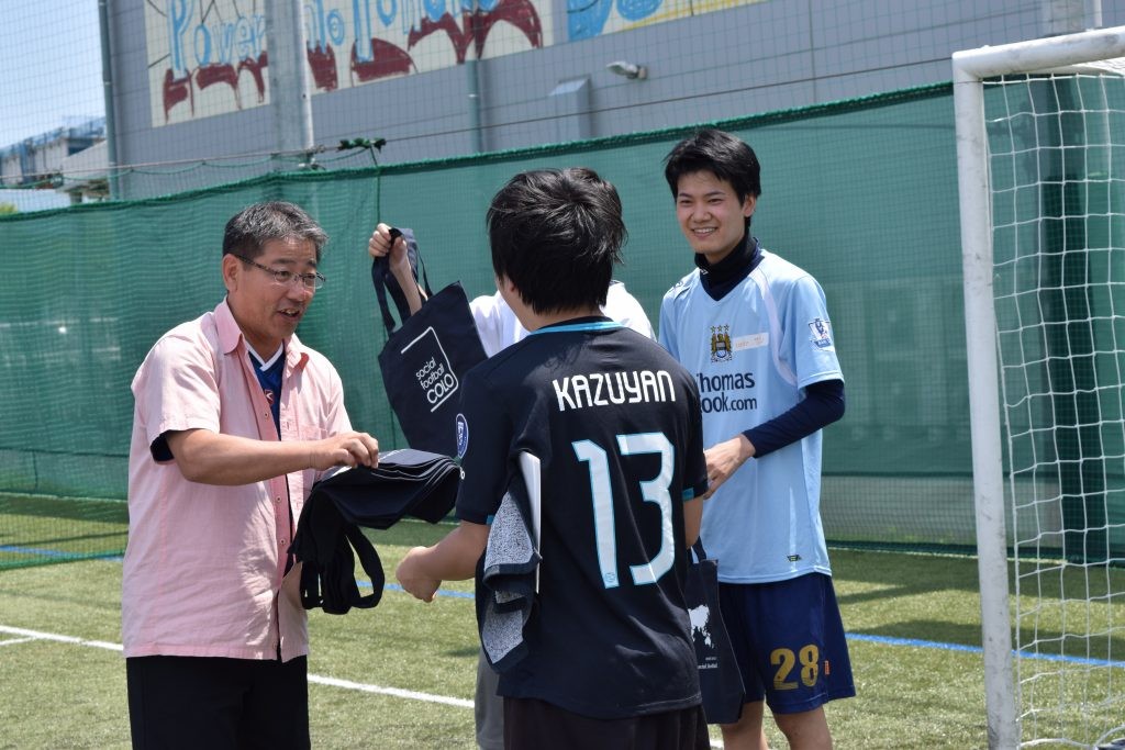 ミニゲームで優勝されたチームの皆さんにsocial football COLOオリジナルトートバッグをプレゼント! 幹事企業である株式会社コスモスモアの緒形社長のからもお言葉をいただきました。