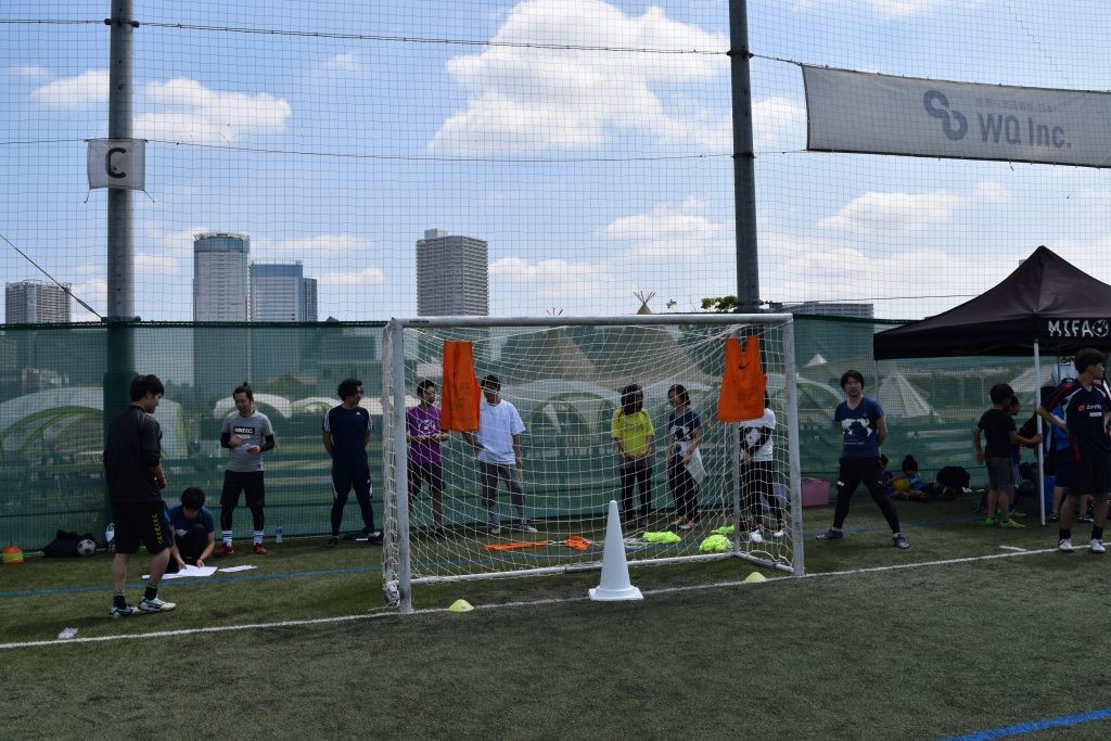 ゴールの中にあるコーン、ビブスにめがけてボールを蹴り得点を競います。