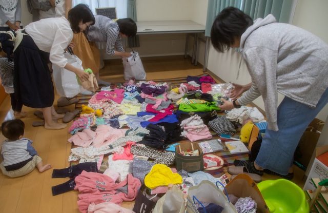 今回は子育てクラブの方のアイディアで不用品の「おゆずり会」を実施しました。雨天のため屋内での開催で品物が集まるか不安がありましたが、当日は特にたくさんのお洋服やおもちゃをお持ちいただきました。好評だったため、次回のハロウィンのイベントでも実施することに!