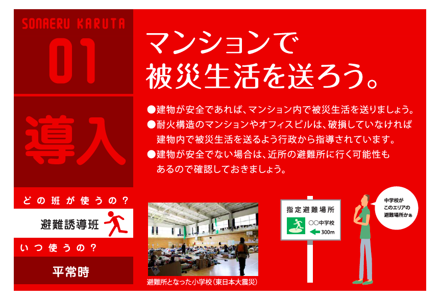 大震災に備え「よき避難者」を育成するCommunity Crossing Japanとアライアンスパートナーである一般社団法人復興応援団、そして、三菱地所レジデンスグループにて、「そなえるカルタ」の制作を行いました。これはマンション防災において、住民が自ら考え、対策を練るためのワークショップツールであり、いざというときはアクション指南書としても使用できるものです。