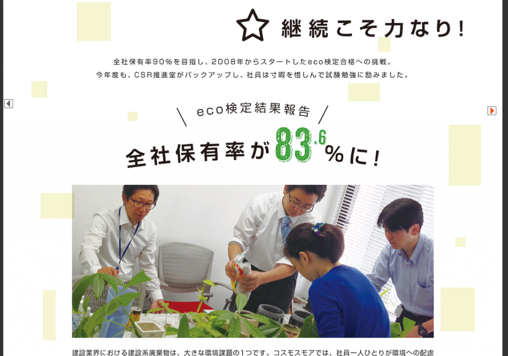 株式会社コスモスモアのCSRレポート「サスモア2014」を制作しました。「more heart-もっと心を込めたCSR」をコンセプトに、読みやすく、躍動感のあるCSRレポートを目指しました。